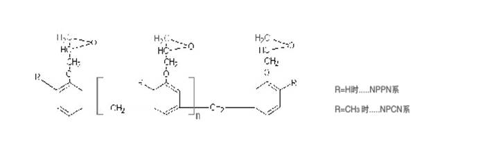 NPPN及NPCN 系苯酚及磷甲酚之酚醛環(huán)氧化產(chǎn)品,其最大特征為耐熱性及耐藥品性佳,非常適合使用于IC封止材及積層板之耐熱改質(zhì)劑等。其化學(xué)結(jié)構(gòu)式如右圖所示: